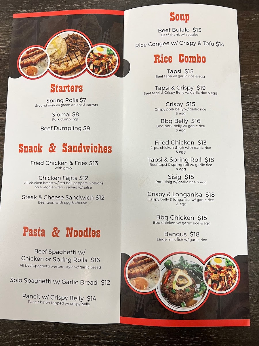 Ideal for gatherings with family or friends, the menu features sharing-friendly dishes such as the Tapsi Crispy Combo and Pancit with Crispy Pork Belly, which complement the welcoming atmosphere. Whether you’re stopping by for a casual lunch or a comforting dinner, options like Sizzling Sisig or Beef Caldereta provide a warm, flavorful experience that pairs well with the simple, laid-back vibe of the restaurant.